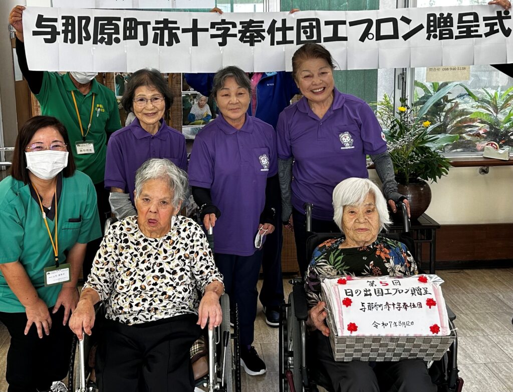 今年度も、与那原町赤十字奉仕団の皆様より心のこもった手作りエプロンを寄贈していただきました。